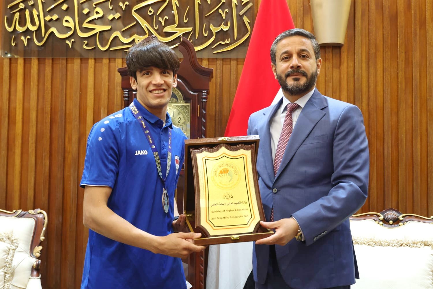 During the meeting, a delegation headed by the Iraqi Muaythai Federation and a number of coaches and players, in the presence of the head of the Iraqi Academics Syndicate, His Excellency, Minister of Higher Education and Scientific Research, Dr. Naeem Abd Yaser Al-Aboudi honored the Iraqi Muaythai national team player who won an advanced level in the World Championship, the champion, Mr. Ali Al-Kenani, who refused to climb the podium as protest against the presence of a competing player from the Zio.ni.st En.ti.ty.