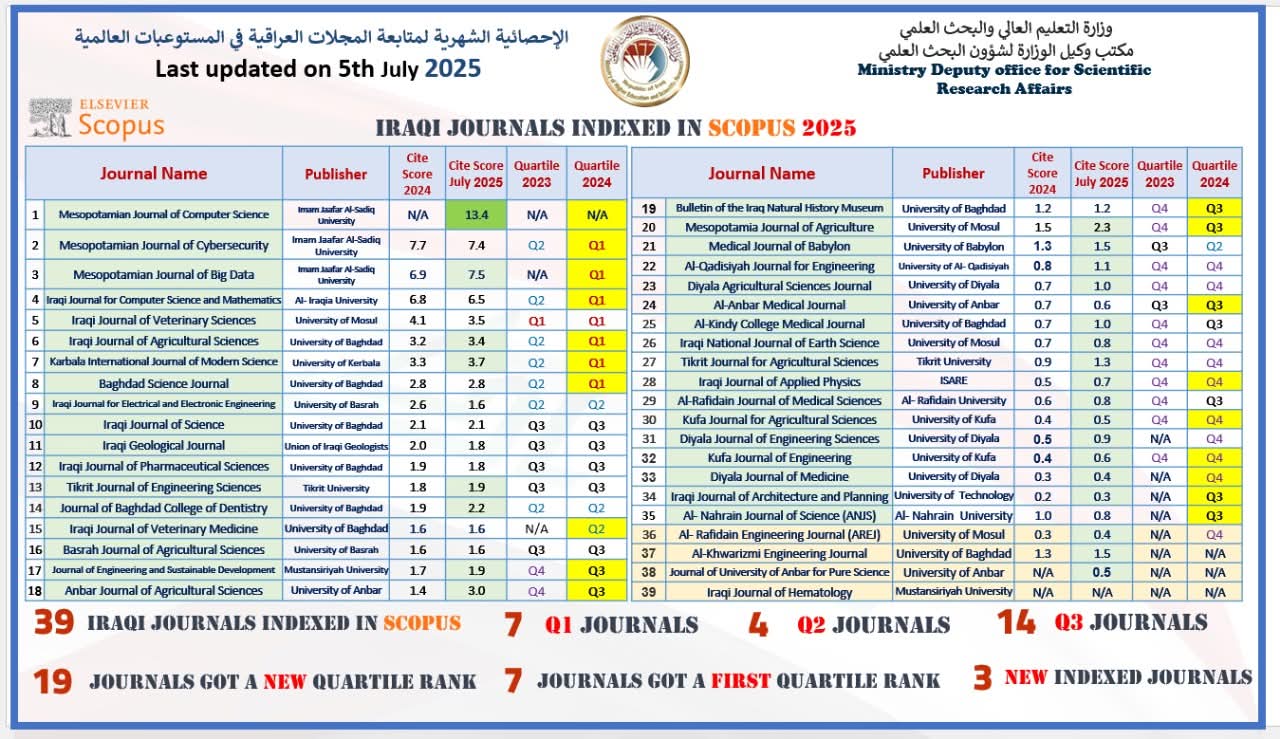 Higher Education demonstrated that “Based on the update issued on July 5, 2025, the number of Iraqi journals listed in the Scopus database reached (39) journals, distributed as follows: