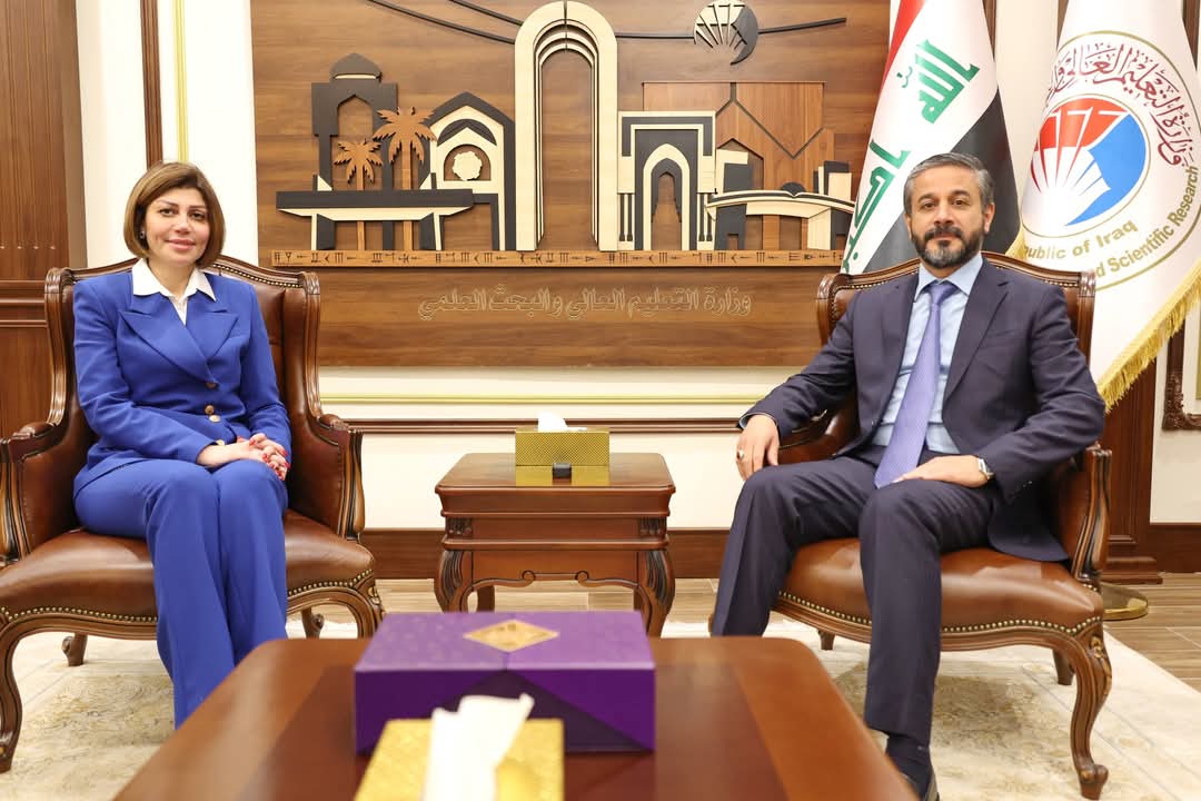During a meeting with the Minister of Migration and Displacement Ms. Evan Faeq Jabro, His Excellency, Minister of Higher Education and Scientific Research, Dr. Naeem Abd Yaser Al-Aboudi reviewed fields of joint bilateral cooperation.