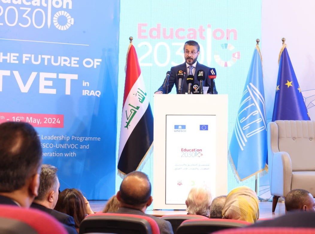 During the conference, from15 to 16, May 2024, which sheds light on international trends and their extent and suitability to the national strategy for education in Iraq (2022-2031) and in cooperation with UNESCO and the European Union, His Excellency, Minister of Higher Education and Scientific Research, Dr. Naeem Abd Yaser Al-Aboudi inaugurated the work of the international conference on the future of education and vocational and technical training in Iraq.