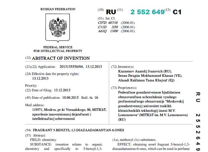 The patent, in which granted by Russian Ministry of Science and Technology, reviewed that the compounds were diagnosed by physical techniques via using precise quantitative analysis of the elements, infrared spectrum and NMR spectrum of the proton as well as mass spectrometer.