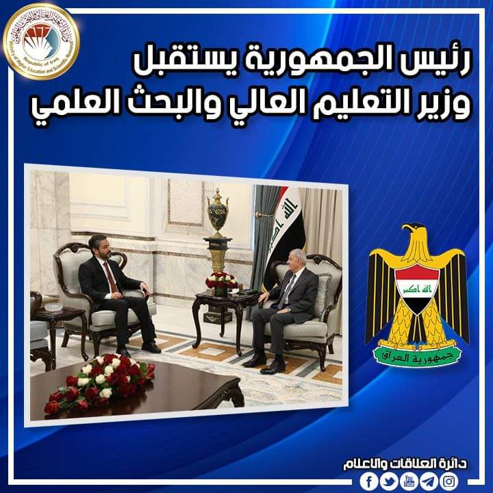 During a meeting with His Excellency, Minister of Higher Education and Scientific Research, Dr. Naeem Abd Yaser Al-Aboudi on Sunday, February 26, 2023 at the Baghdad Palace, His Excellency the President of the Republic of Iraq, Dr. Abdul Latif Jamal Rashid stressed on the need to pay attention to the scientific aspect as the basis of the community.