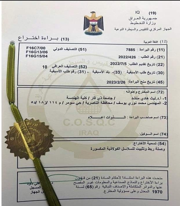 University of Thi-Qar obtained a patent on developing of a link and fixation link for broken steel chains.