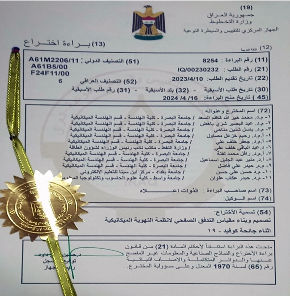 Universities of Baghdad, Basrah and Wasit obtain joint patent the design and construction of a laminar flow meter for mechanical ventilation systems.