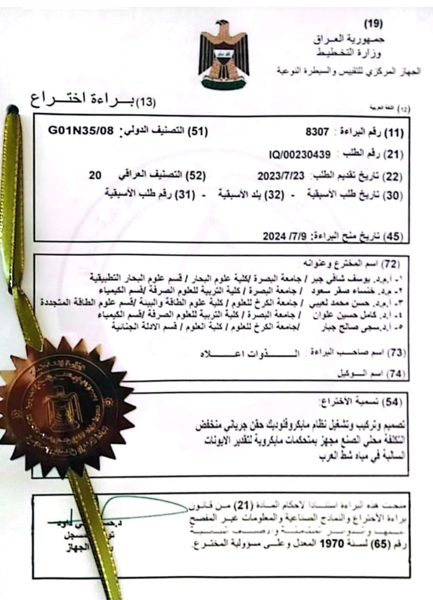 Universities of Basrah and Al-Karkh of Science obtain a joint patent on installation and operation of a locally manufactured low-cost microfluidic flow injection system equipped with microcontrollers to estimate negative ions in Shatt Al-Arab waters.